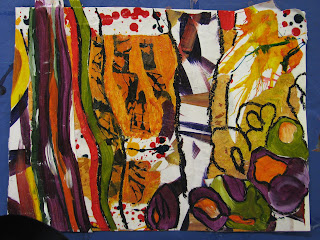 After a short chocolate and chips break (!), the students were put to work "drawing their day"...what would your day look like if you drew it as a continuous line, without lifting your pen from the page? These drawings were then painted with water soluble crayons.
